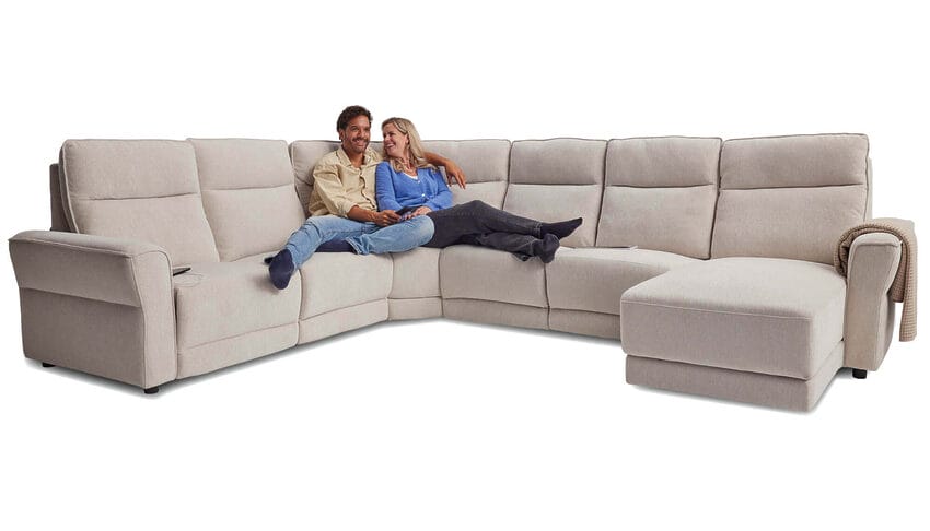 De nieuw West U bank combineert praktisch comfort met een eigentijds design. De hoge rugleuningen geven uw rug en nek de steun die u zoekt, ideaal voor lange avonden ontspannen zitten. Het elektrische relaxsysteem maakt het verschil: zowel de voetsteunen als het eiland zijn verstelbaar, zodat u altijd uw ideale zithouding vindt. Het geheel wordt afgerond door het lage designmodel met subtiele horizontale accenten, wat de bank een rustige maar moderne uitstraling geeft.