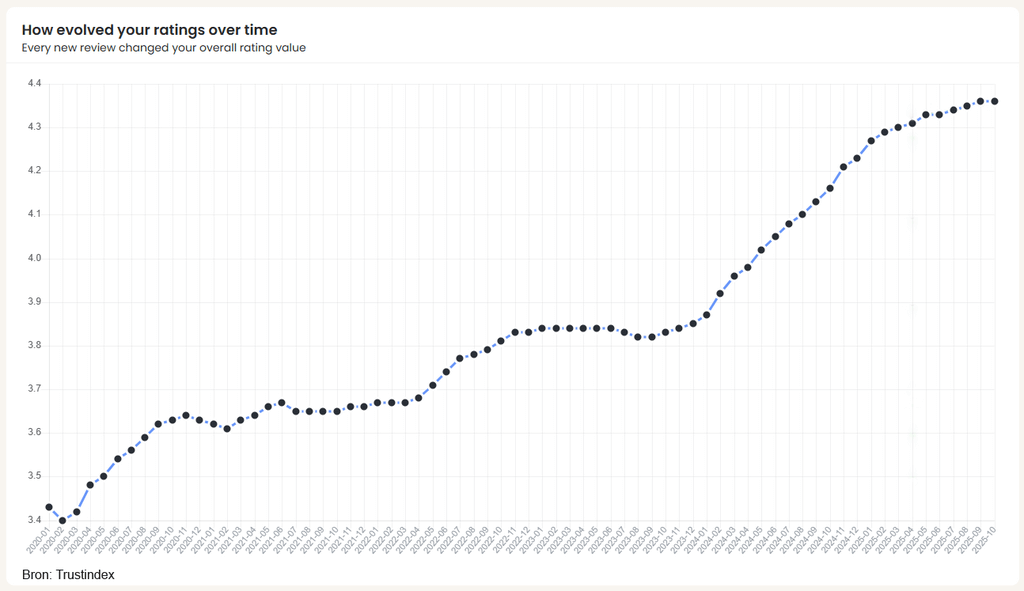 De groei naar 4.23 sterren én 4.65 gemiddeld in de afgelopen 30 dagen (op de datum van publicatie van dit stuk) is geen toeval. Het is het resultaat van duizenden verbeteringen, grote en kleine, uitgevoerd door teams die dagelijks met passie werken aan tevreden klanten. En dat stopt niet. We blijven investeren in service, transparantie en kwaliteit.